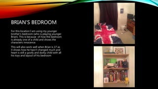 This document discusses potential filming locations for the movie RECCE, including Brian's bedroom to show his childhood innocence, the church to show his traditional upbringing, Anthony's house for a dark integration scene at the beginning, and the driveway where Brian exits looking cool on his bike to end the opening scene.