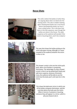 The document provides test shots and descriptions for a short film about school bullies. It describes shots of the bullies arguing on a sofa about a missing victim. Another shot shows the bullies picking on the victim before they go missing. A key shot shows one bully seeing the victim in a bathroom mirror. The shots are meant to build suspense about whether the victim is dead or alive and haunting the bullies.