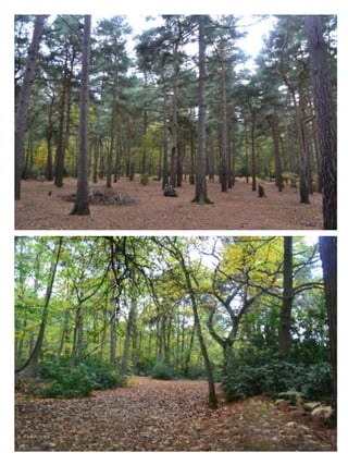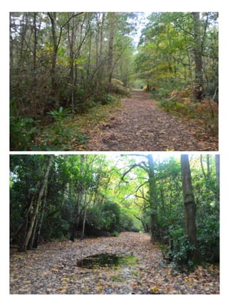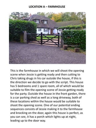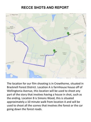 This document provides location information for a film shoot in Crowthorne, England. Location A is a farmhouse off Wellingtonia Avenue that will be used for interior house scenes. Location B, called Simons Wood, is a 10 minute walk from the farmhouse and will be used for forest and country lane scenes. Specific details are given about how each location can be used, including rooms in the farmhouse and different landscape areas in the forest. Both locations may experience mud and wet weather that need to be considered in planning.