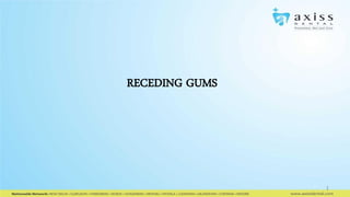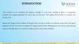 Gum recession occurs gradually over many years as the gums recede from the teeth. Early signs include sensitive teeth and roots becoming visible below the gumline. Gum recession can be caused by factors like improper brushing, periodontal disease, genetics, or tooth grinding. Treatment focuses on addressing the underlying cause, such as improving oral hygiene habits or adjusting a misaligned bite, in order to stop further recession.
