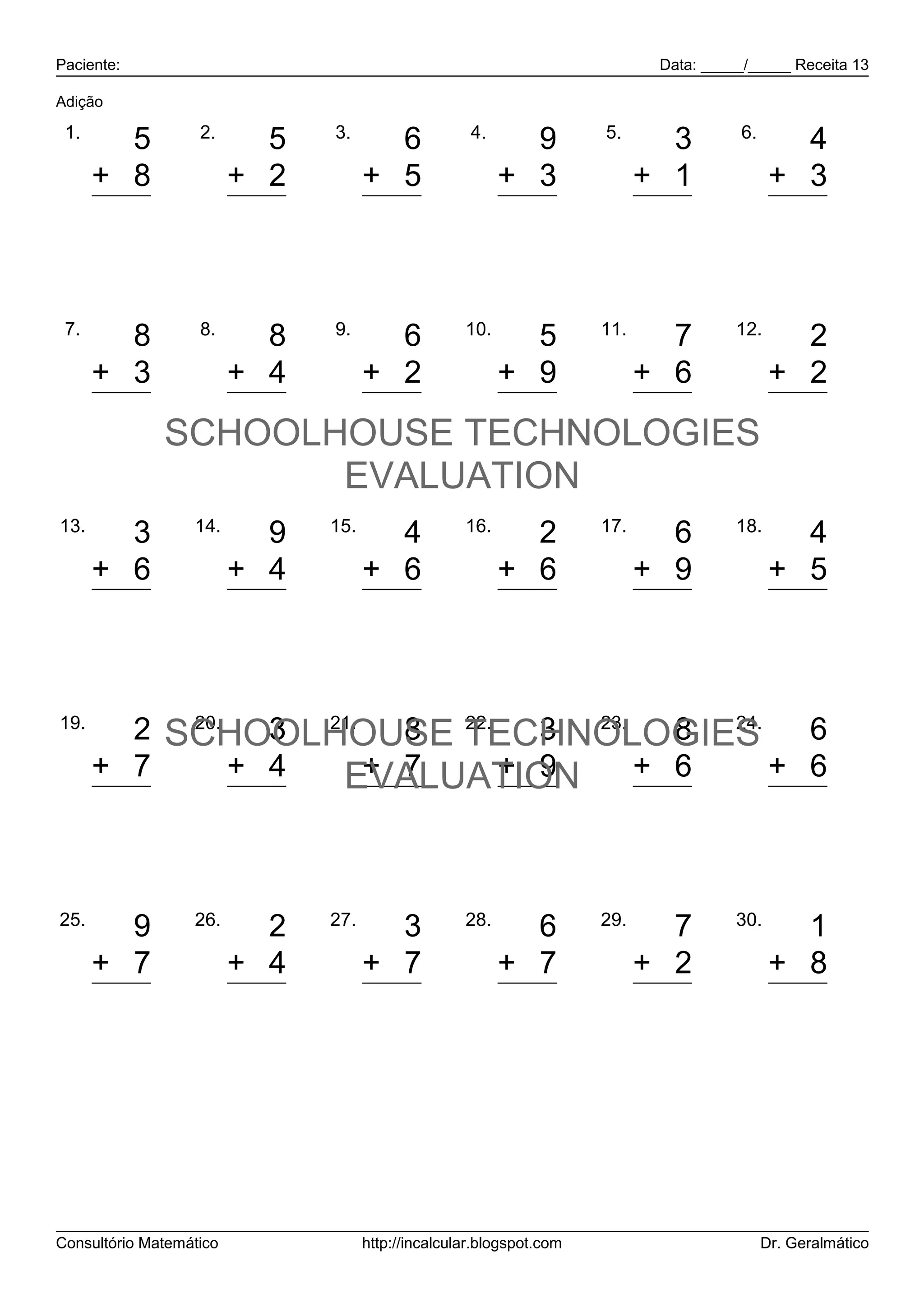 Data: _____/_____ Receita 13 Adição 1. 2. 3. 4. 5. 6. 5 5 6 9 3 4 + 8 + 2 + 5 + 3 + 1 + 3 13 7 11 12 4 7 7. 8. 9. 10. 11. 12. 8 8 6 5 7 2 + 3 + 4 + 2 + 9 + 6 + 2 11 12 8 14 13 4 SCHOOLHOUSE TECHNOLOGIES EVALUATION 13. 14. 15. 16. 17. 18. 3 9 4 2 6 4 + 6 + 4 + 6 + 6 + 9 + 5 9 13 10 8 15 9 19. 20. 3 21. 8 22. 3 23. 2 SCHOOLHOUSE TECHNOLOGIES 8 24. 6 + 7 + 4 EVALUATION + 6 + 7 + 9 + 6 9 7 15 12 14 12 25. 26. 27. 28. 29. 30. 9 2 3 6 7 1 + 7 + 4 + 7 + 7 + 2 + 8 16 6 10 13 9 9 Consultório Matemático http://incalcular.blogspot.com Dr. Geralmático