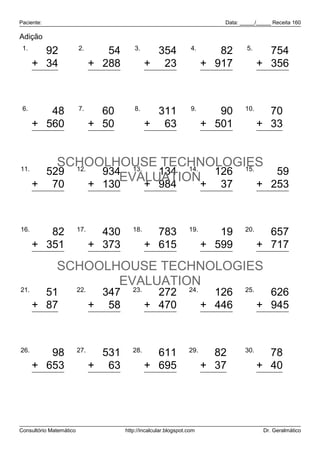 Data: _____/_____ Receita 160 Adição 1. 2. 3. 4. 5. 92 54 354 82 754 + 34 + 288 + 23 + 917 + 356 126 342 377 999 1.110 6. 7. 8. 9. 10. 48 60 311 90 70 + 560 + 50 + 63 + 501 + 33 608 110 374 591 103 11. SCHOOLHOUSE TECHNOLOGIES 529 12. 934 13. 134 14. 126 15. 59 EVALUATION+ 37 + 70 + 130 + 984 + 253 599 1.064 1.118 163 312 16. 17. 18. 19. 20. 82 430 783 19 657 + 351 + 373 + 615 + 599 + 717 433 803 1.398 618 1.374 SCHOOLHOUSE TECHNOLOGIES EVALUATION 21. 22. 23. 24. 25. 51 347 272 126 626 + 87 + 58 + 470 + 446 + 945 138 405 742 572 1.571 26. 27. 28. 29. 30. 98 531 611 82 78 + 653 + 63 + 695 + 37 + 40 751 594 1.306 119 118 Consultório Matemático http://incalcular.blogspot.com Dr. Geralmático