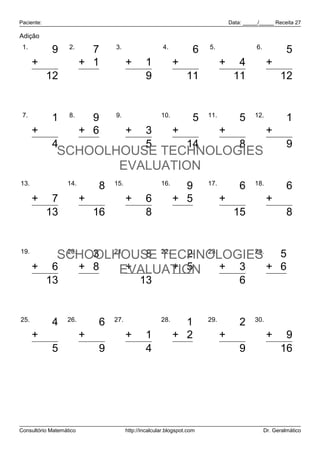 Data: _____/_____ Receita 27 Adição 1. 2. 3. 4. 5. 6. 9 7 8 6 7 5 + 3 + 1 + 1 + 5 + 4 + 7 12 8 9 11 11 12 7. 8. 9. 10. 11. 12. 1 9 2 5 5 1 + 3 + 6 + 3 + 9 + 3 + 8 4 15 5 14 8 9 SCHOOLHOUSE TECHNOLOGIES EVALUATION 13. 14. 15. 16. 17. 18. 6 8 2 9 6 6 + 7 + 8 + 6 + 5 + 9 + 2 13 16 8 14 15 8 19. 20. 3 21. 8 22. 7SCHOOLHOUSE TECHNOLOGIES2 23. 3 24. 5 + 6 + 8 EVALUATION + 3 + 5 + 5 + 6 13 11 13 7 6 11 25. 26. 27. 28. 29. 30. 4 6 3 1 2 7 + 1 + 3 + 1 + 2 + 7 + 9 5 9 4 3 9 16 Consultório Matemático http://incalcular.blogspot.com Dr. Geralmático