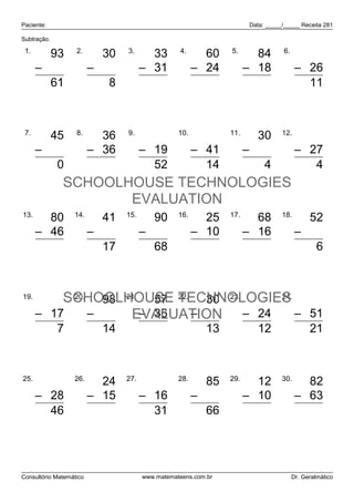 Data: _____/_____ Receita 281 Subtração. 1. 2. 3. 4. 5. 6. 93 30 33 60 84 37 – 32 – 22 – 31 – 24 – 18 – 26 61 8 2 36 66 11 7. 8. 9. 10. 11. 12. 45 36 71 55 30 31 – 45 – 36 – 19 – 41 – 26 – 27 0 0 52 14 4 4 SCHOOLHOUSE TECHNOLOGIES EVALUATION 13. 14. 15. 16. 17. 18. 80 41 90 25 68 52 – 46 – 24 – 22 – 10 – 16 – 46 34 17 68 15 52 6 19. 24SCHOOLHOUSE TECHNOLOGIES 20. 98 21. 57 22. 30 23. 36 24. 72 – 17 – 84 EVALUATION – 36 – 17 – 24 – 51 7 14 21 13 12 21 25. 26. 27. 28. 29. 30. 74 24 47 85 12 82 – 28 – 15 – 16 – 19 – 10 – 63 46 9 31 66 2 19 Consultório Matemático www.matemateens.com.br Dr. Geralmático