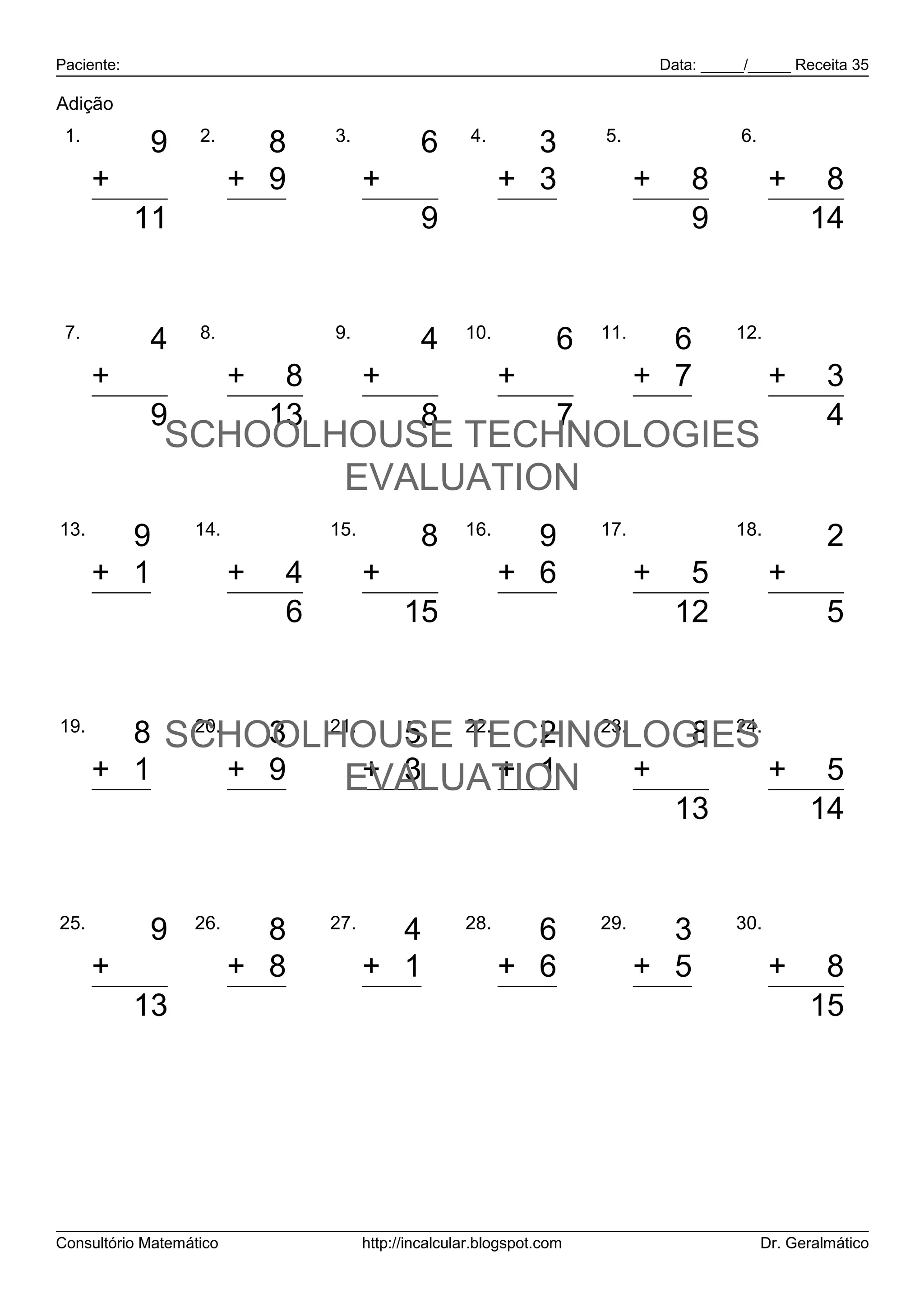 Data: _____/_____ Receita 35 Adição 1. 2. 3. 4. 5. 6. 9 8 6 3 1 6 + 2 + 9 + 3 + 3 + 8 + 8 11 17 9 6 9 14 7. 8. 9. 10. 11. 12. 4 5 4 6 6 1 + 5 + 8 + 4 + 1 + 7 + 3 9 13 8 7 13 4 SCHOOLHOUSE TECHNOLOGIES EVALUATION 13. 14. 15. 16. 17. 18. 9 2 8 9 7 2 + 1 + 4 + 7 + 6 + 5 + 3 10 6 15 15 12 5 19. 20. 3 21. 5 22. 2 23. 8 SCHOOLHOUSE TECHNOLOGIES 8 24. 9 + 1 + 9 EVALUATION + 5 + 3 + 1 + 5 9 12 8 3 13 14 25. 26. 27. 28. 29. 30. 9 8 4 6 3 7 + 4 + 8 + 1 + 6 + 5 + 8 13 16 5 12 8 15 Consultório Matemático http://incalcular.blogspot.com Dr. Geralmático
