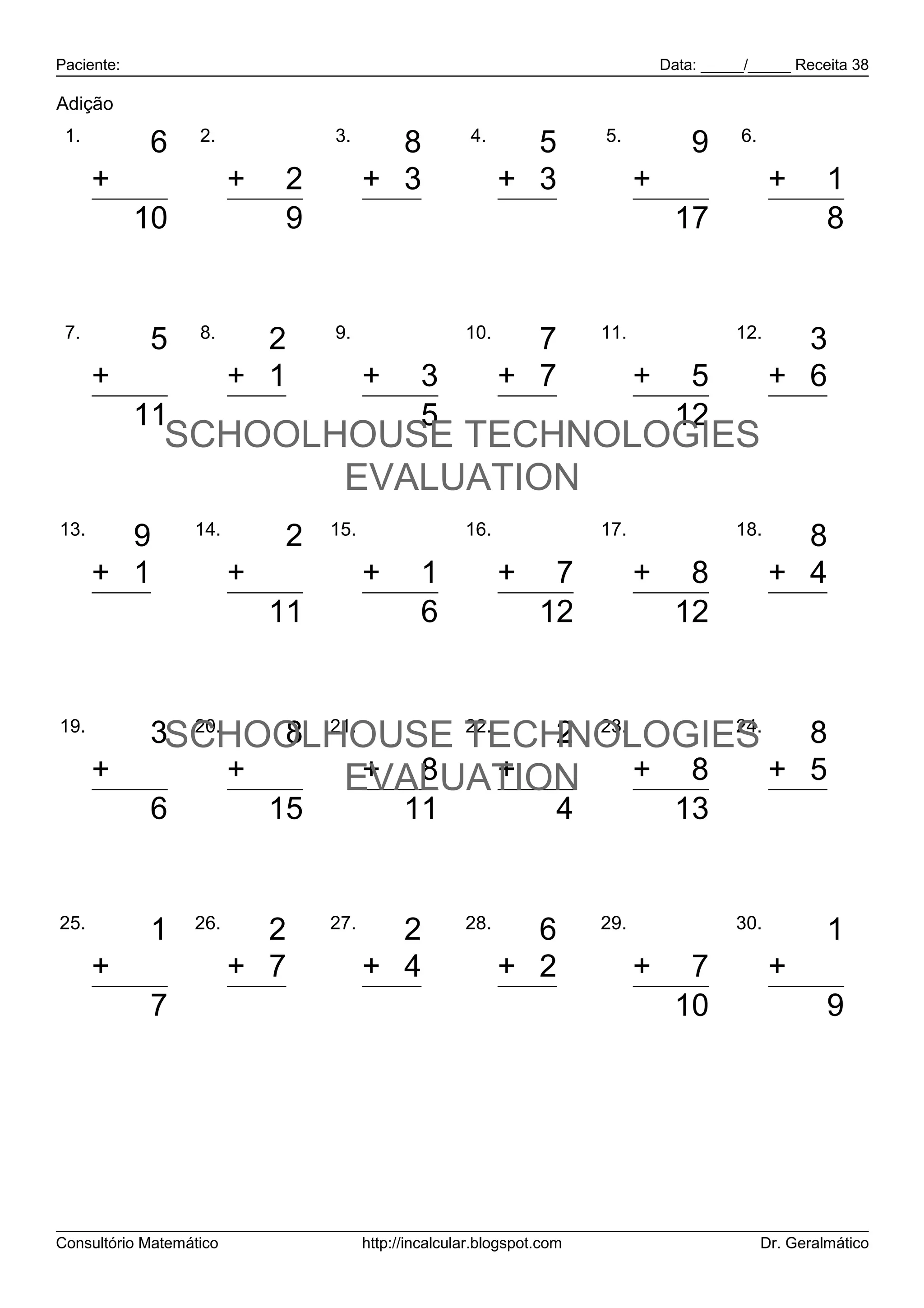 Data: _____/_____ Receita 38 Adição 1. 2. 3. 4. 5. 6. 6 7 8 5 9 7 + 4 + 2 + 3 + 3 + 8 + 1 10 9 11 8 17 8 7. 8. 9. 10. 11. 12. 5 2 2 7 7 3 + 6 + 1 + 3 + 7 + 5 + 6 11 3 5 14 12 9 SCHOOLHOUSE TECHNOLOGIES EVALUATION 13. 14. 15. 16. 17. 18. 9 2 5 5 4 8 + 1 + 9 + 1 + 7 + 8 + 4 10 11 6 12 12 12 19. 20. 8 21. 3 22. 3SCHOOLHOUSE TECHNOLOGIES 2 23. 5 24. 8 + 3 + 7 EVALUATION + 8 + 2 + 8 + 5 6 15 11 4 13 13 25. 26. 27. 28. 29. 30. 1 2 2 6 3 1 + 6 + 7 + 4 + 2 + 7 + 8 7 9 6 8 10 9 Consultório Matemático http://incalcular.blogspot.com Dr. Geralmático