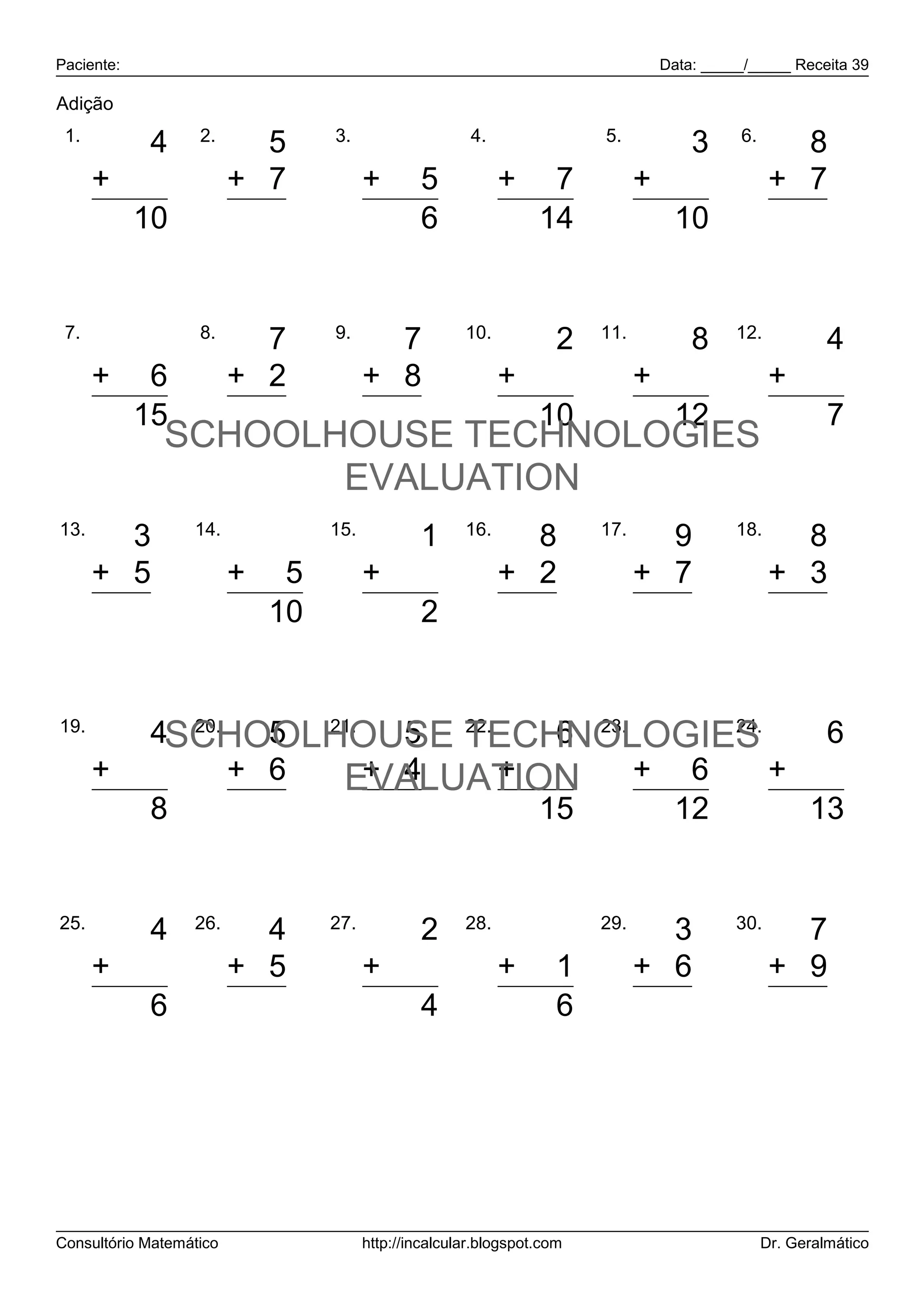 Data: _____/_____ Receita 39 Adição 1. 2. 3. 4. 5. 6. 4 5 1 7 3 8 + 6 + 7 + 5 + 7 + 7 + 7 10 12 6 14 10 15 7. 8. 9. 10. 11. 12. 9 7 7 2 8 4 + 6 + 2 + 8 + 8 + 4 + 3 15 9 15 10 12 7 SCHOOLHOUSE TECHNOLOGIES EVALUATION 13. 14. 15. 16. 17. 18. 3 5 1 8 9 8 + 5 + 5 + 1 + 2 + 7 + 3 8 10 2 10 16 11 19. 20. 5 21. 5 22. 4SCHOOLHOUSE TECHNOLOGIES6 23. 6 24. 6 + 4 + 6 EVALUATION + 6 + 4 + 9 + 7 8 11 9 15 12 13 25. 26. 27. 28. 29. 30. 4 4 2 5 3 7 + 2 + 5 + 2 + 1 + 6 + 9 6 9 4 6 9 16 Consultório Matemático http://incalcular.blogspot.com Dr. Geralmático