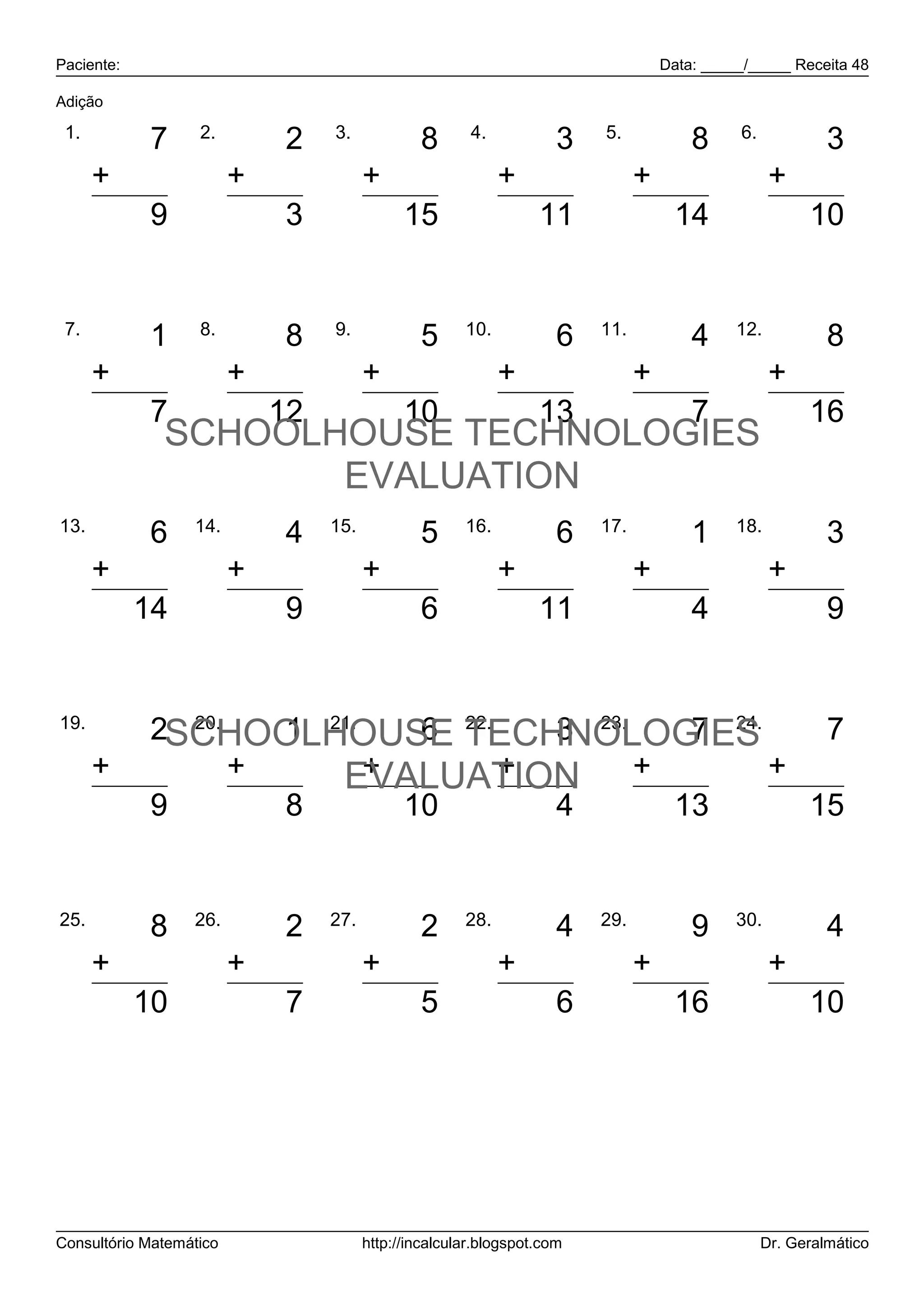 Data: _____/_____ Receita 48 Adição 1. 2. 3. 4. 5. 6. 7 2 8 3 8 3 + 2 + 1 + 7 + 8 + 6 + 7 9 3 15 11 14 10 7. 8. 9. 10. 11. 12. 1 8 5 6 4 8 + 6 + 4 + 5 + 7 + 3 + 8 7 12 10 13 7 16 SCHOOLHOUSE TECHNOLOGIES EVALUATION 13. 14. 15. 16. 17. 18. 6 4 5 6 1 3 + 8 + 5 + 1 + 5 + 3 + 6 14 9 6 11 4 9 19. 20. 1 21. 6 22. 2SCHOOLHOUSE TECHNOLOGIES3 23. 7 24. 7 + 7 + 7 EVALUATION + 4 + 1 + 6 + 8 9 8 10 4 13 15 25. 26. 27. 28. 29. 30. 8 2 2 4 9 4 + 2 + 5 + 3 + 2 + 7 + 6 10 7 5 6 16 10 Consultório Matemático http://incalcular.blogspot.com Dr. Geralmático