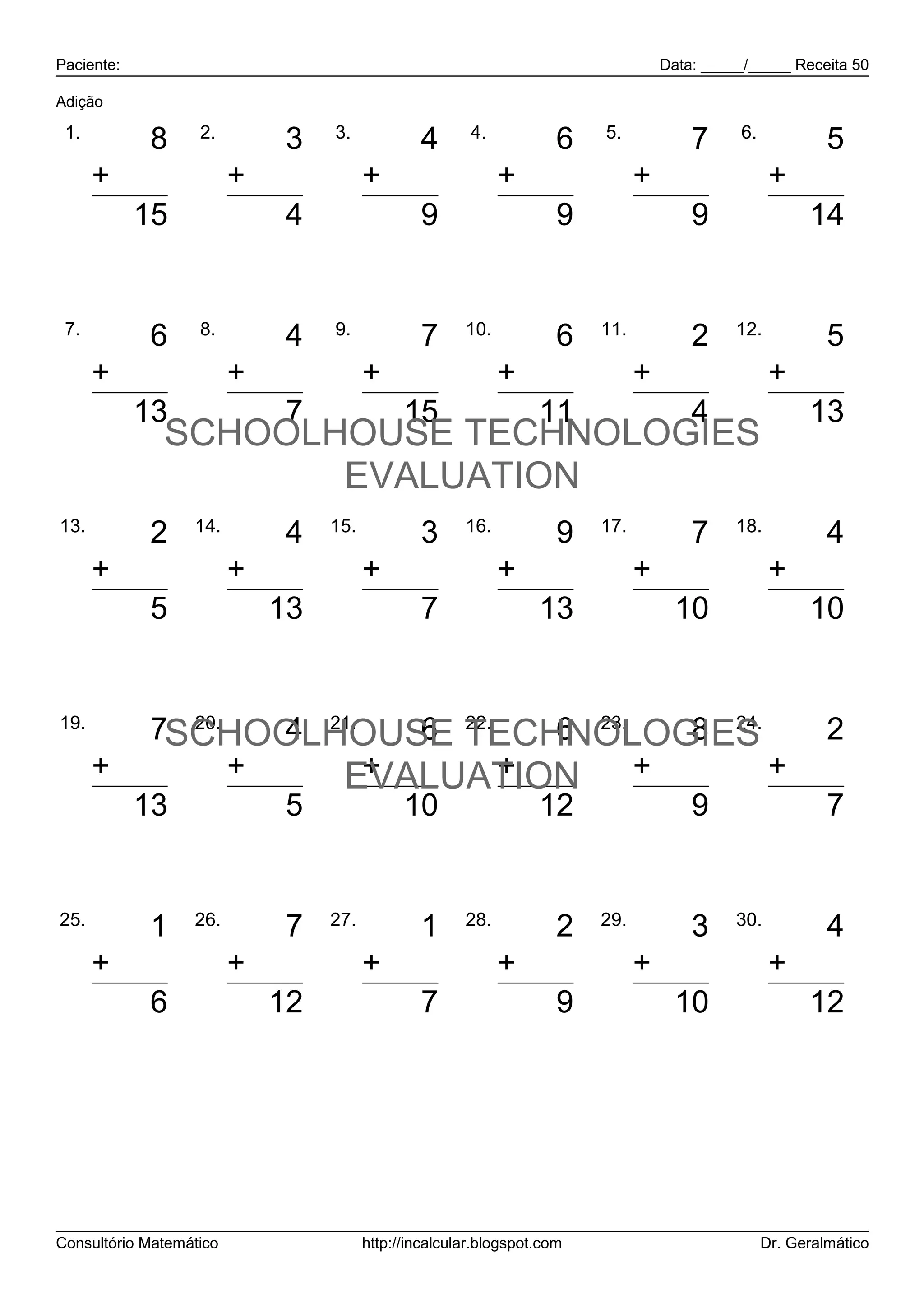 Data: _____/_____ Receita 50 Adição 1. 2. 3. 4. 5. 6. 8 3 4 6 7 5 + 7 + 1 + 5 + 3 + 2 + 9 15 4 9 9 9 14 7. 8. 9. 10. 11. 12. 6 4 7 6 2 5 + 7 + 3 + 8 + 5 + 2 + 8 13 7 15 11 4 13 SCHOOLHOUSE TECHNOLOGIES EVALUATION 13. 14. 15. 16. 17. 18. 2 4 3 9 7 4 + 3 + 9 + 4 + 4 + 3 + 6 5 13 7 13 10 10 19. 20. 4 21. 6 22. 7SCHOOLHOUSE TECHNOLOGIES 6 23. 8 24. 2 + 6 + 1 EVALUATION + 4 + 6 + 1 + 5 13 5 10 12 9 7 25. 26. 27. 28. 29. 30. 1 7 1 2 3 4 + 5 + 5 + 6 + 7 + 7 + 8 6 12 7 9 10 12 Consultório Matemático http://incalcular.blogspot.com Dr. Geralmático
