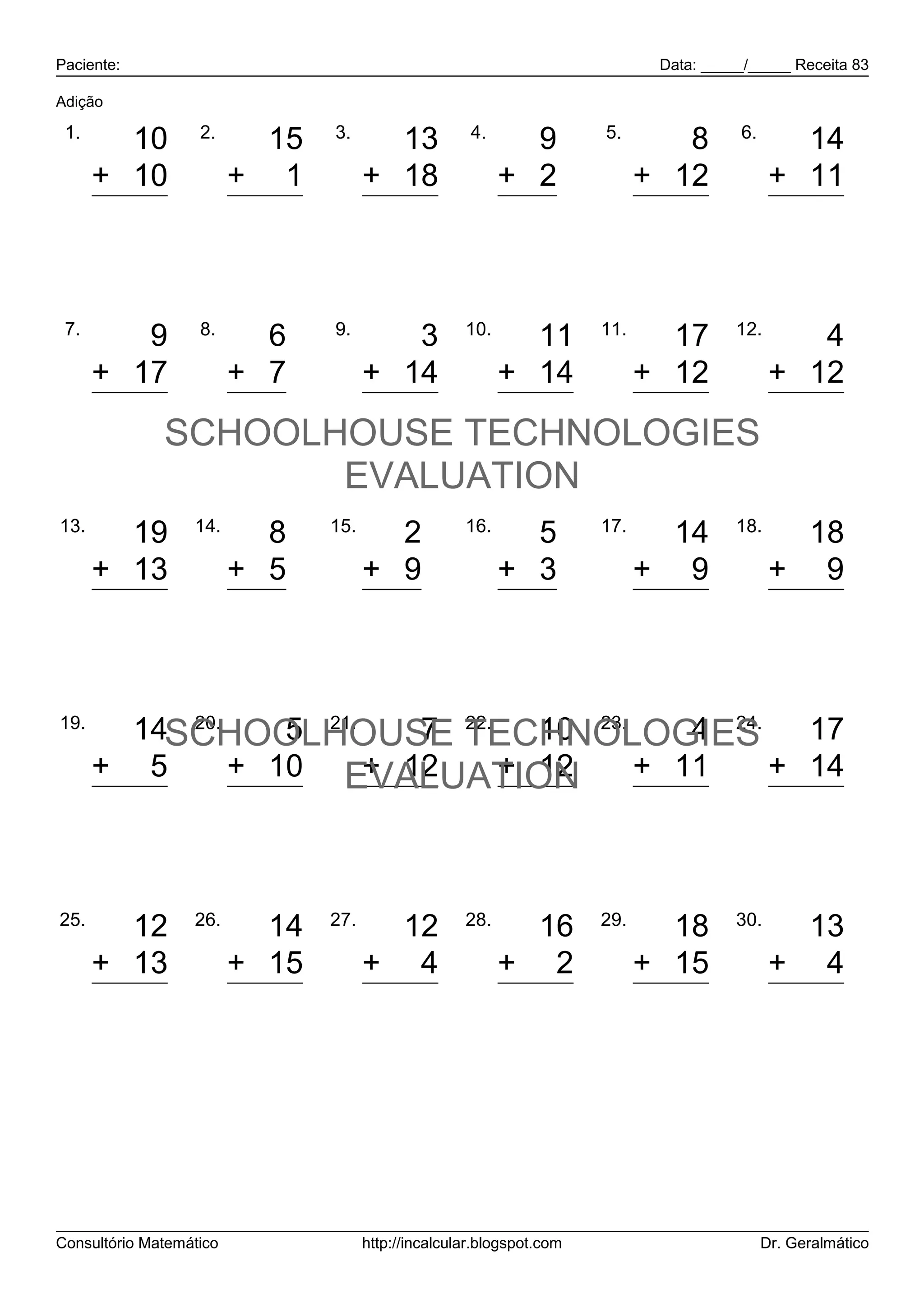 Data: _____/_____ Receita 83 Adição 1. 2. 3. 4. 5. 6. 10 15 13 9 8 14 + 10 + 1 + 18 + 2 + 12 + 11 20 16 31 11 20 25 7. 8. 9. 10. 11. 12. 9 6 3 11 17 4 + 17 + 7 + 14 + 14 + 12 + 12 26 13 17 25 29 16 SCHOOLHOUSE TECHNOLOGIES EVALUATION 13. 14. 15. 16. 17. 18. 19 8 2 5 14 18 + 13 + 5 + 9 + 3 + 9 + 9 32 13 11 8 23 27 19. 20. 5 21. 7 22. 14SCHOOLHOUSE TECHNOLOGIES 10 23. 4 24. 17 + 5 + 10 EVALUATION + 12 + 12 + 11 + 14 19 15 19 22 15 31 25. 26. 27. 28. 29. 30. 12 14 12 16 18 13 + 13 + 15 + 4 + 2 + 15 + 4 25 29 16 18 33 17 Consultório Matemático http://incalcular.blogspot.com Dr. Geralmático