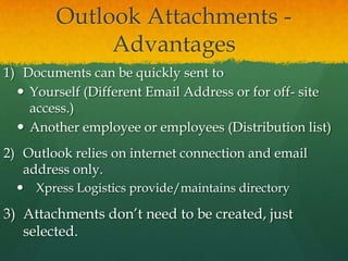 Advantages of using Outlook attachments include being able to quickly send documents to yourself for off-site access, distribute documents to employees or distribution lists, and select existing documents without needing to create new files. Disadvantages include attachments possibly being overlooked in a busy inbox, requiring documents to be scanned if only a physical copy exists, and some employees like shop floor personnel rarely checking email requiring indirect sending through supervisors.