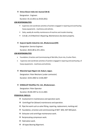 This resume is for Rabindra Kumar Kar, who has 14 years of experience in mechanical works. He is currently the Plant In-Charge at D. Thakkar Cont. Pvt. Ltd in Chourai, Chhindwada, Madhya Pradesh, where he oversees daily maintenance schedules, production, quality control, and supervises subordinates. Prior to this role, he held engineering positions in Nigeria and West Bengal, where he was responsible for maintenance, production, supervising workers, and completing daily reports. He has extensive skills in maintenance, operations, fabrication, and other mechanical areas. Educationally, he has an ITI certification in Fitting and secondary level qualifications.