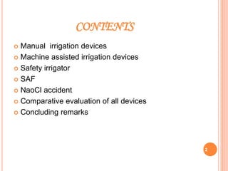 This document summarizes recent advances in irrigation devices used in endodontics. It describes both manual and machine-assisted irrigation techniques. For manual techniques, it discusses syringe irrigation with different needle types, use of brushes, and manual dynamic irrigation. It also covers machine-assisted devices like rotary brushes, continuous irrigation during instrumentation, sonic irrigation with devices like the Rispisonic file and Endoactivator. The document provides details on how each technique works and its advantages over other methods.