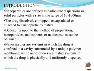 This document summarizes recent advances in nanotechnology. It discusses various nanoscale particles and structures such as nanoparticles, nanospheres, nanocapsules, liposomes, quantum dots, nanotubes, nanoshells, dendrimers, paramagnetic particles, respirocytes, microbivores, and nanobubbles. It describes their structures, methods of preparation, and applications in drug delivery, imaging, and medicine. The document also discusses companies involved in producing nanoparticles and concludes that nanoparticles can improve drug solubility and bioavailability, have high cellular uptake, and deliver therapeutic agents to a wide range of biological targets due to their small size and mobility.