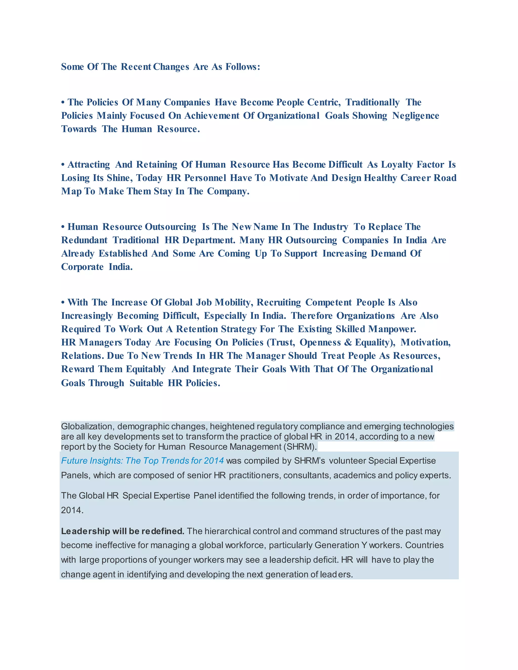 The document summarizes recent changes and trends in human resource management. Key changes include companies adopting more people-centric policies that focus on employee well-being and motivation rather than just organizational goals. Additionally, retaining skilled employees is becoming more difficult so companies must implement strategies to encourage retention. A growing trend is also outsourcing HR functions to specialist firms. Looking ahead, the top global HR trends for 2014 according to experts will include redefining leadership away from hierarchy, navigating changing immigration laws, addressing skills gaps through training, and effectively managing increasingly diverse global workforces.