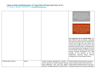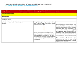 The document provides an update on provisions related to foreign exchange management (FEMA) and foreign direct investment (FDI) in India. Key changes include clarifying that investments made on a non-repatriable basis are treated as domestic rather than foreign investments. For FDI, investments in unlisted companies are treated as FDI, while for listed companies only investments of 10% or more equity are considered FDI. Other updates relate to share issuance timelines, valuation methods, employee stock ownership plans, and external commercial borrowing regulations.