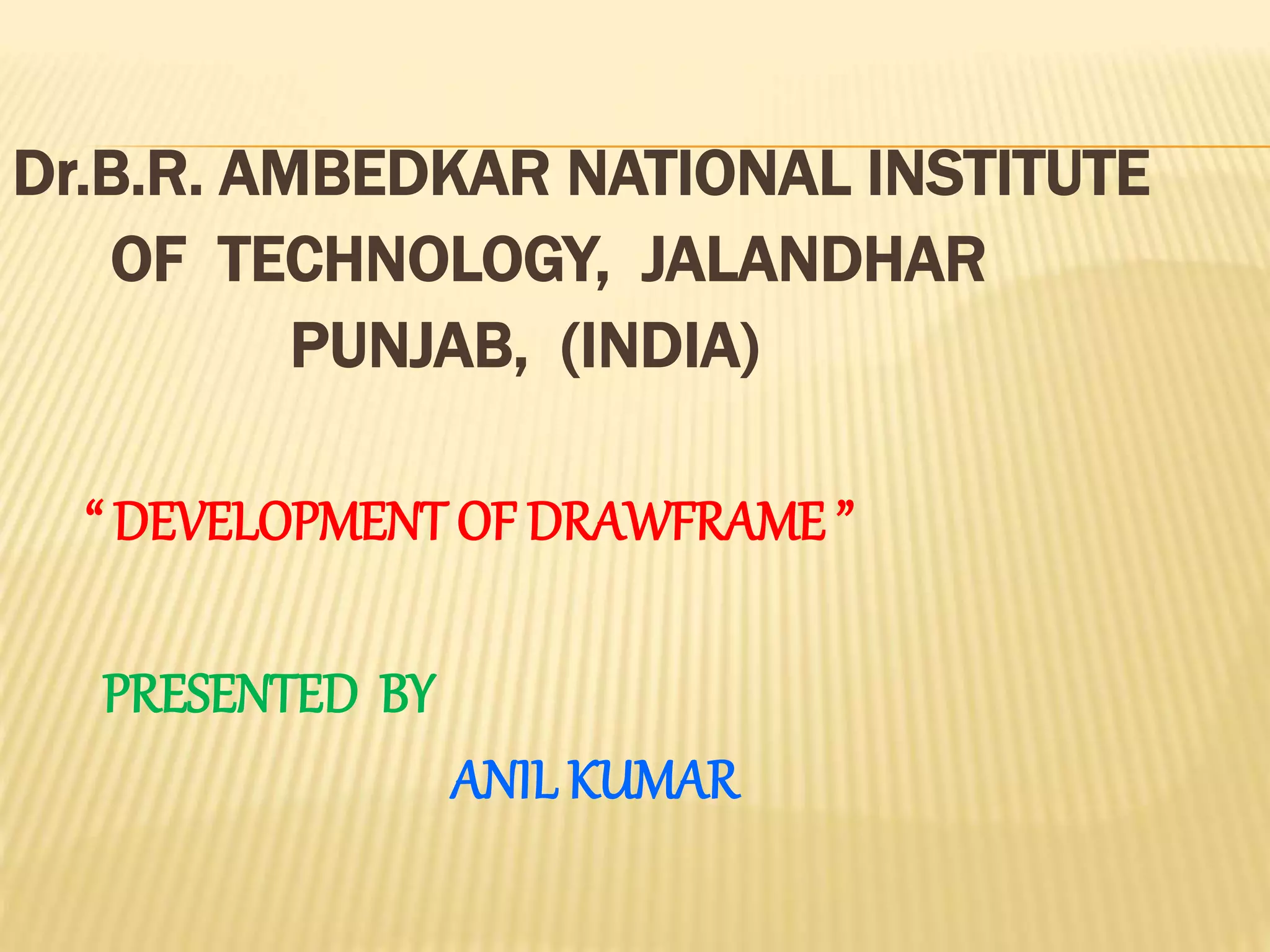 This document discusses the development of drawframes in the spinning process. It describes key components and functions of drawframes, including drafting, doubling, and blending of slivers. Recent developments that improve quality, such as autolevellers and automatic break draft setting, are also covered. The document provides specifications for drawframe models from different manufacturers and concludes by discussing the use of new monitoring technologies like cameras and microwave sensors to further enhance sliver quality.
