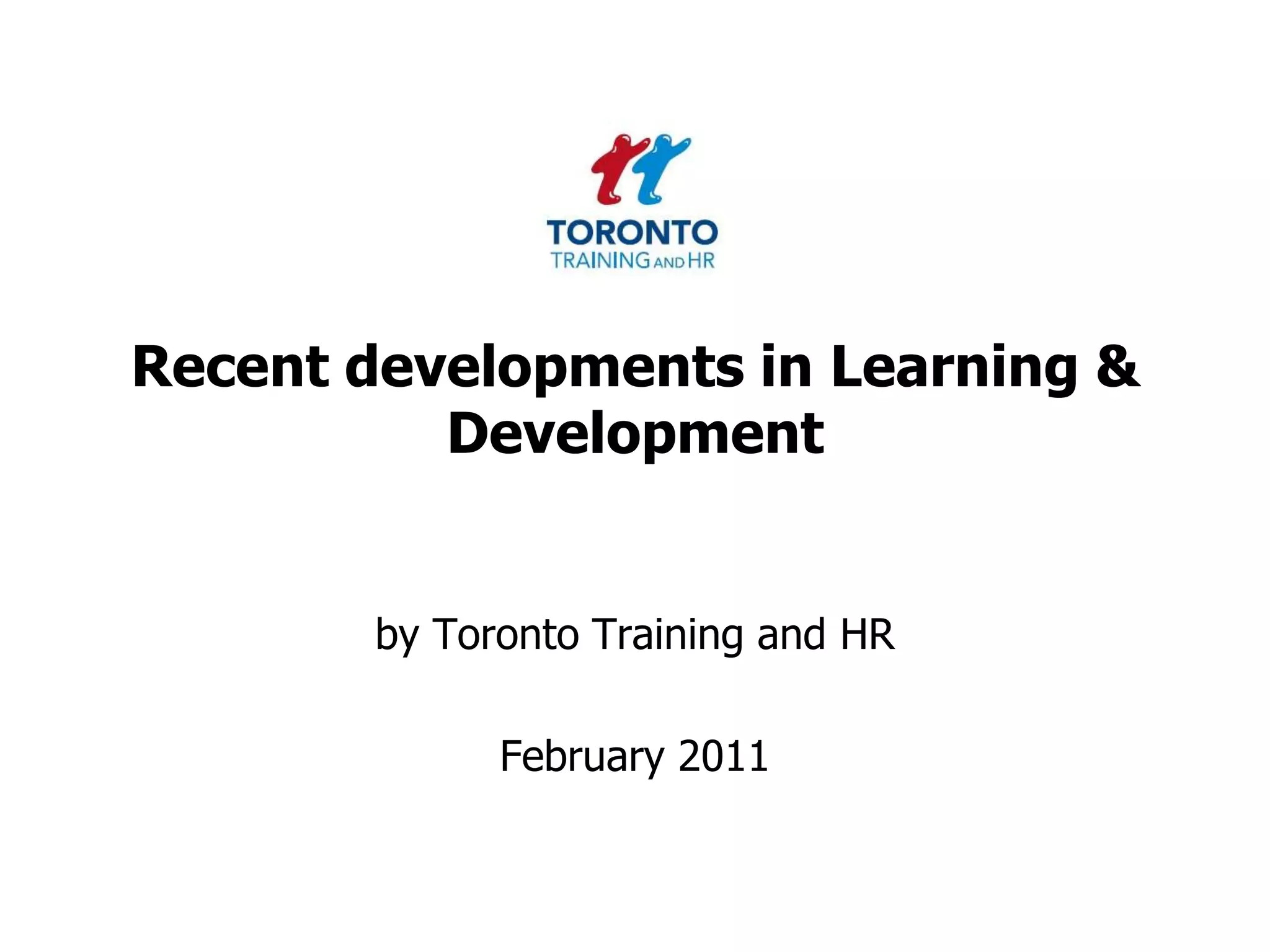 The document discusses recent developments in learning and development, highlighting strategies for maintaining effective training during difficult financial times, utilizing evaluation results, and measuring return on investment. It emphasizes the importance of integrating learning into workflow, leveraging social media, and employing mobile learning while also addressing leadership development and talent management. The content includes practical recommendations and case studies to enhance organizational learning and employee engagement.