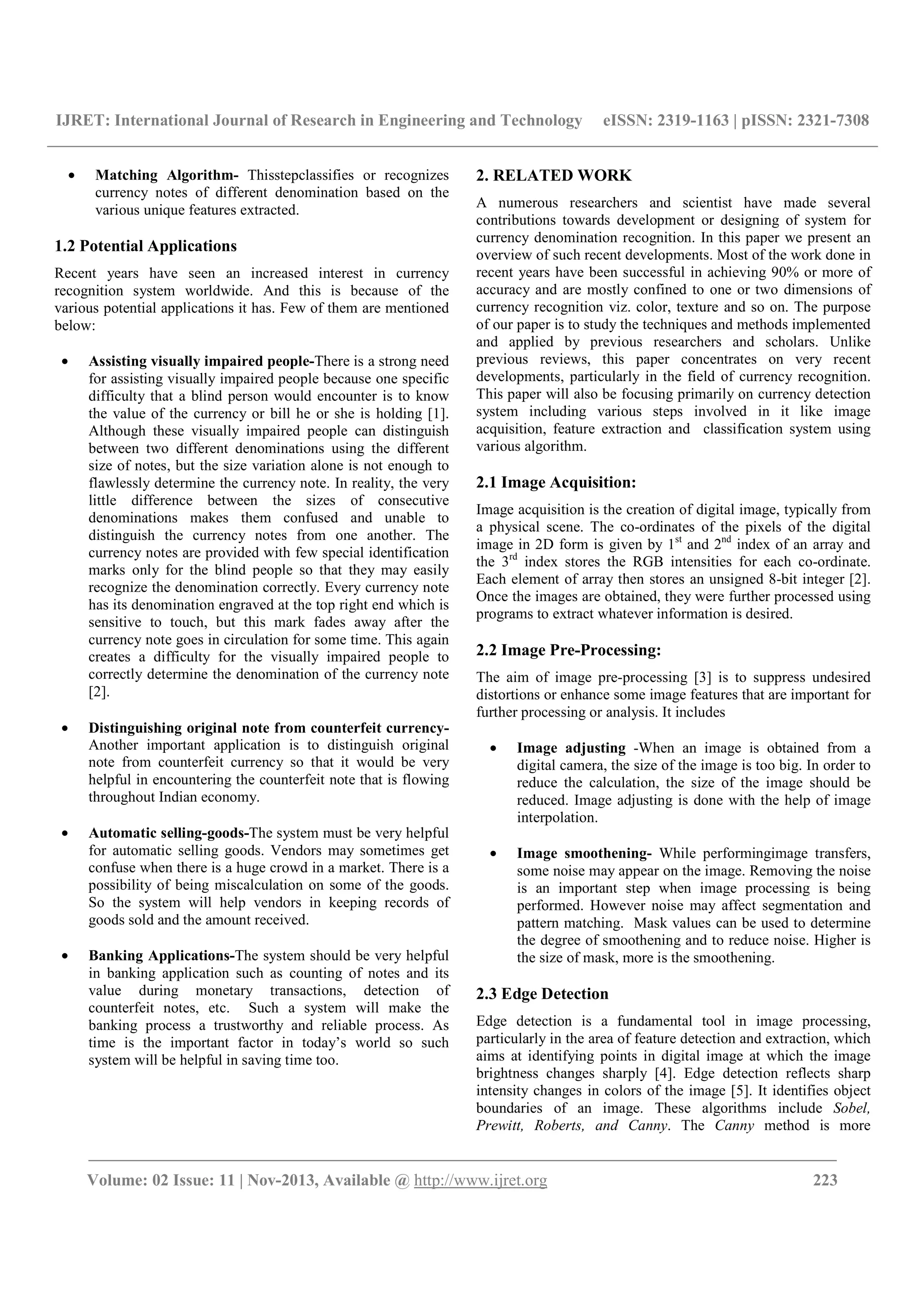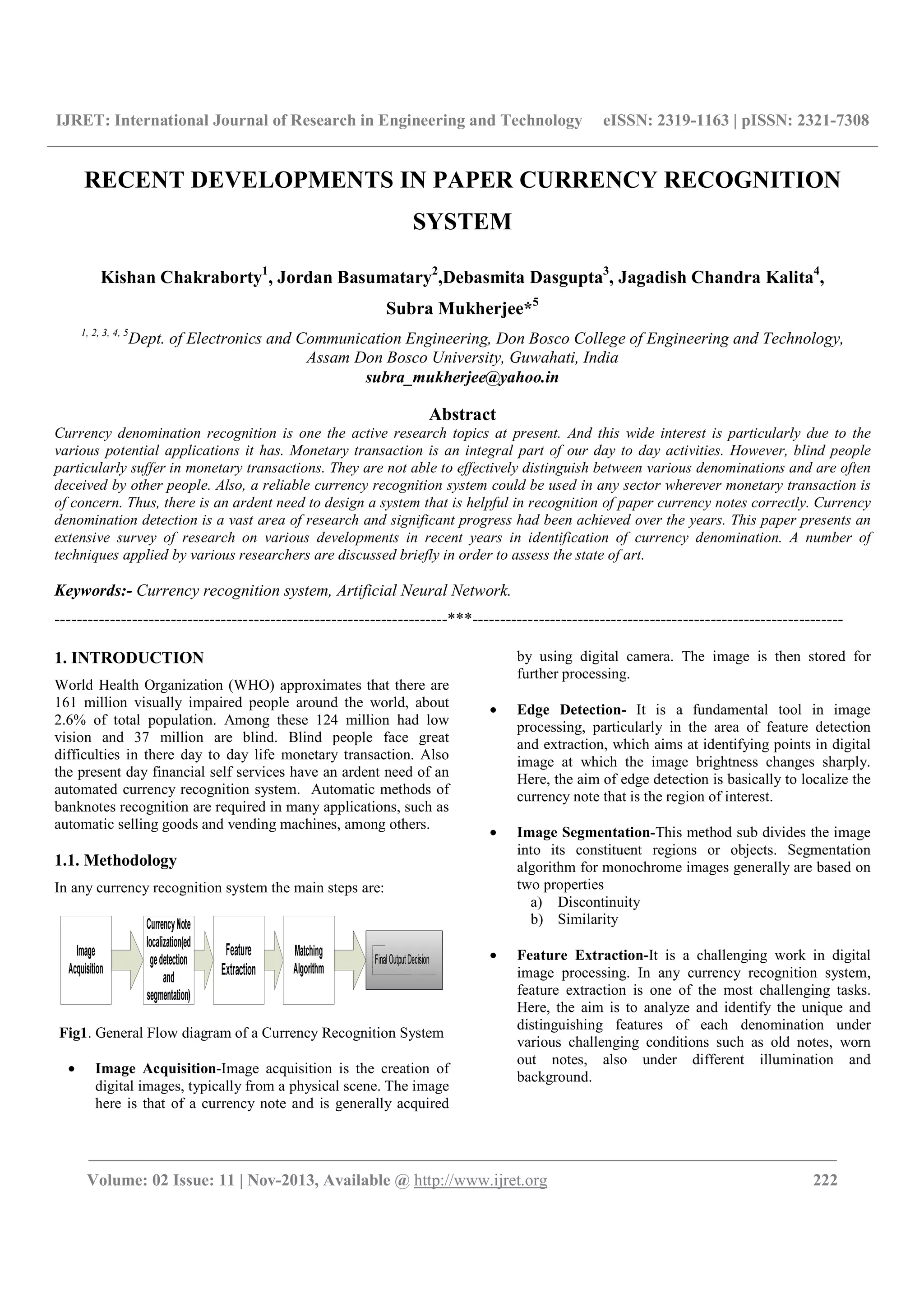 The document discusses recent advancements in currency denomination recognition systems, highlighting their importance for assisting visually impaired individuals and enhancing automatic monetary transactions. It reviews various techniques employed in currency recognition, such as image acquisition, edge detection, feature extraction, and the use of neural networks for classification. The paper also underscores the ongoing challenges in achieving robust and reliable recognition systems and presents a comprehensive overview of current methodologies and their applications.