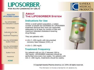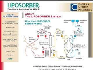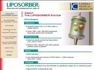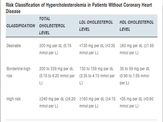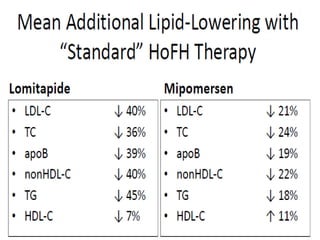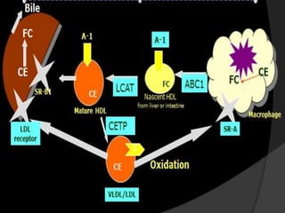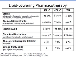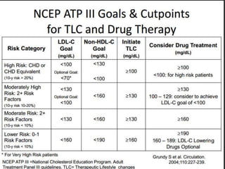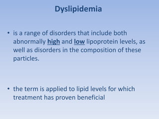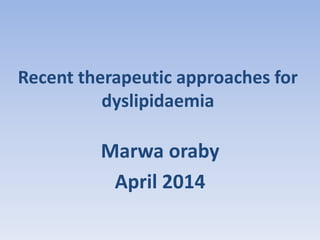 This document summarizes recent therapeutic approaches for dyslipidemia. It discusses lifestyle changes like smoking cessation, weight loss, improved diet, and increased physical activity. It also discusses pharmacological management including ATP III guidelines, novel therapies that block lipoprotein output or increase clearance like PCSK9 inhibitors. Therapies to raise anti-atherogenic lipoproteins by promoting ApoA1 production or cholesterol efflux are also covered, as well as therapies slowing HDL removal and dual PPAR agonists. Surgical modalities like partial ileal bypass and liver transplantation are mentioned for severe dyslipidemia cases.