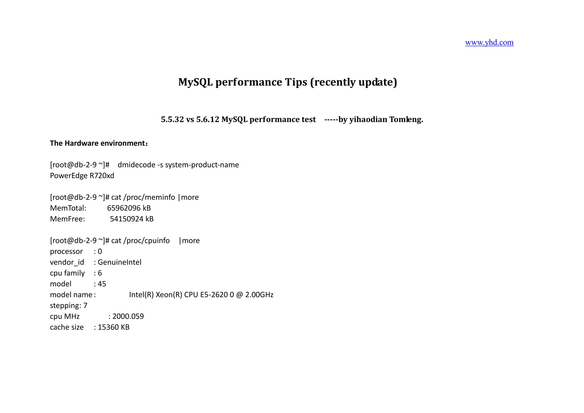 The document compares the performance of MySQL installed from binary versus from source code on a Dell PowerEdge R815 server with 4 CPUs and 48 cores. TPCC tests were run against both installations using the same parameters except for port number. The source code installation outperformed the binary installation, achieving 6586.6 transactions per minute versus 5606.6 transactions per minute for the binary installation in a test with 1 client and 50 warehouses over 60 seconds.
