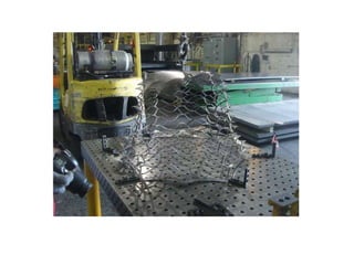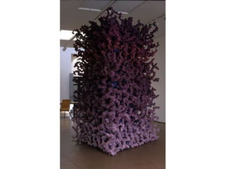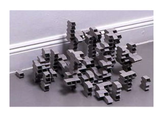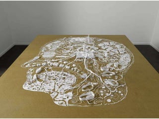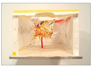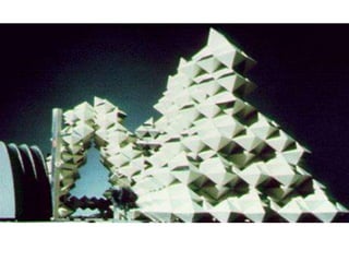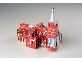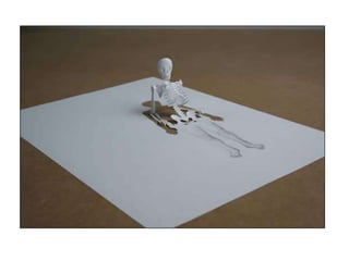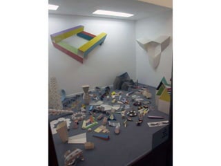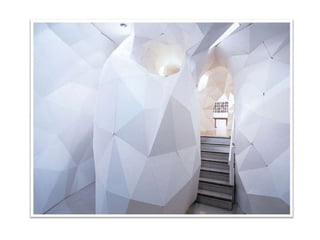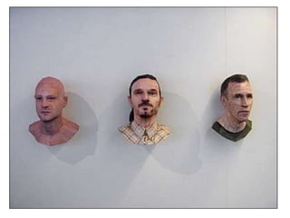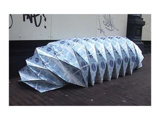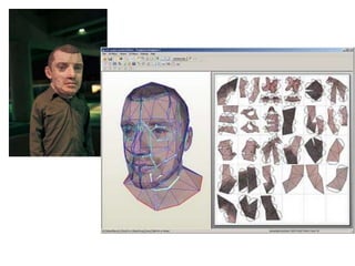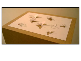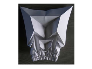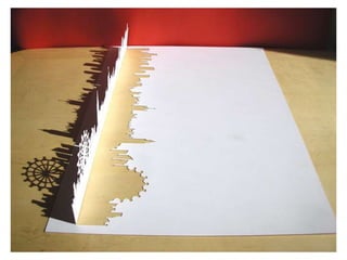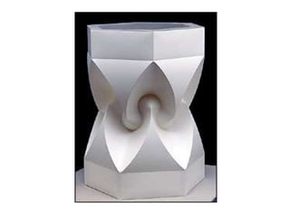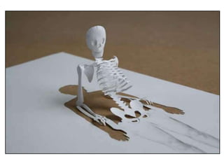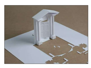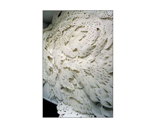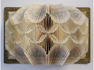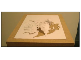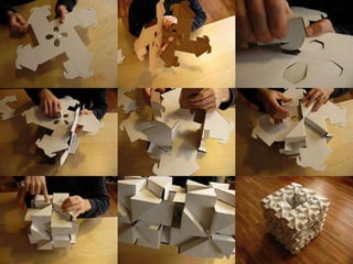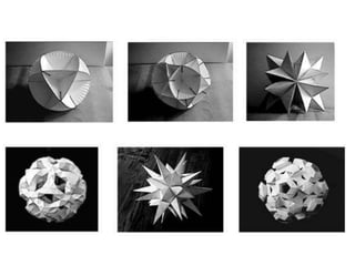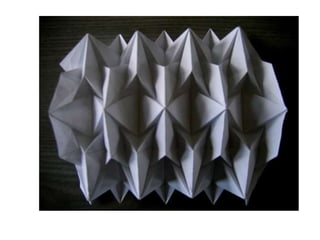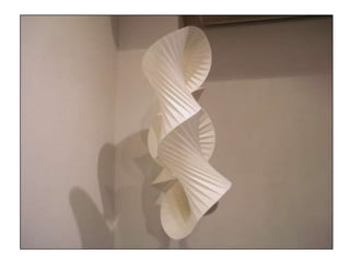 The document discusses paper sculpture, mentioning artists like Lars England and Tom Friedman who create modular and scored paper sculptures. It provides links to resources on pepakura, a method for making 3D models by folding and assembling paper pieces, as well as a YouTube video and website demonstrating metamorphic paper sculptures that transform shapes. Additional links direct to websites with templates and instructions for creating paper sculptures through folding techniques.