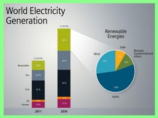 The document discusses the importance of renewable energy as an alternative to conventional energy sources, highlighting the environmental damage caused by exploitation of non-renewable resources. It presents India’s current standing and potential in harnessing renewable sources such as solar, wind, biomass, and geothermal energy, indicating a need for increased utilization. The content emphasizes the collaborative effort of government and public initiatives to boost renewable energy generation for sustainable development.
