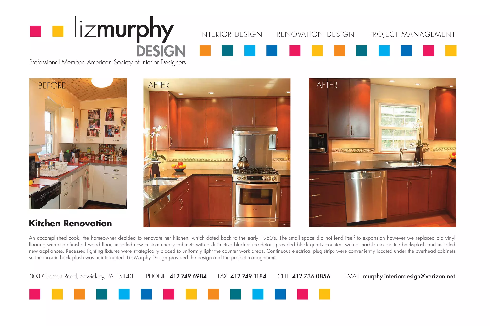 The document outlines various interior design renovation projects managed by Liz Murphy Design, featuring a kitchen renovation that updated a 1960s space with modern fixtures and materials while maximizing functionality. Additionally, a living room redesign aimed to create a cohesive and inviting atmosphere for entertaining guests through thoughtful furniture arrangements and decor choices. Each project emphasizes the professional design management and creativity involved in transforming the homeowners' spaces.