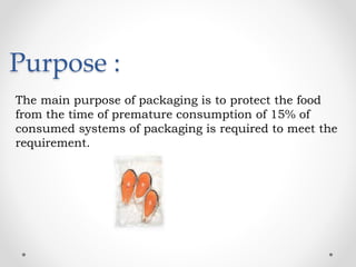 Vacuum packaging and modified atmosphere packaging are common fish packaging methods that help extend shelf life. Vacuum packaging removes oxygen which inhibits bacterial growth but risks anaerobic bacteria growth. Modified atmosphere packaging replaces air with gas mixtures like carbon dioxide to control microbes. Other packaging methods discussed include shrink packaging, aseptic packaging, and active and intelligent packaging technologies that absorb or release substances to further prolong shelf life and food quality. Active indicators can also provide information on food freshness and safety conditions.
