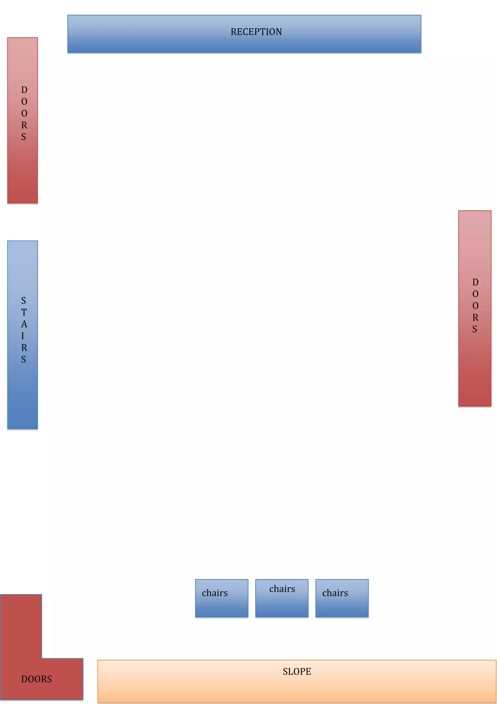 This floor plan shows a reception area with doors on the left and right sides and stairs in the center, with chairs arranged around the perimeter. There are also chairs arranged on a sloped area. The words "doors" and "chairs" are repeated throughout to label the different areas and furnishings.