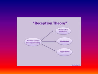 This document provides an overview of reception theory, which emphasizes how audiences receive and interpret media texts. It explains that producers encode texts with intended meanings or messages, but audiences can decode them in different ways - either correctly understanding the message, rejecting it, or misunderstanding it. The document outlines Stuart Hall's three types of audience decoding: dominant/preferred, where the audience agrees with the producer's message; negotiated, where the audience selectively accepts or refines the message; and oppositional, where the audience recognizes but rejects the dominant meaning. Examples are given of each type of decoding for a hypothetical media production on cyberbullying.