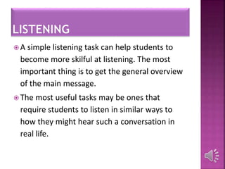The document discusses different listening and reading skills and strategies. It describes tasks to help students improve their listening skills, including listening for the main message and details. It also discusses top-down and bottom-up listening approaches. For reading, it discusses reading speed, scanning, skimming, reading for detail, and extensive reading. It emphasizes getting the overall message for listening and reading. It provides examples of listening and reading tasks and the importance of feedback.