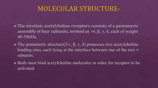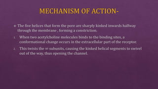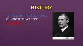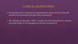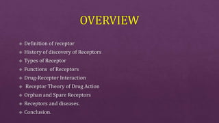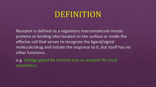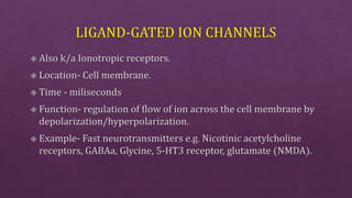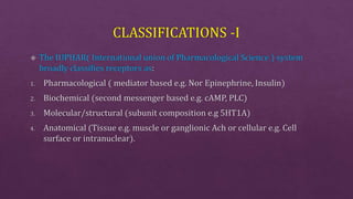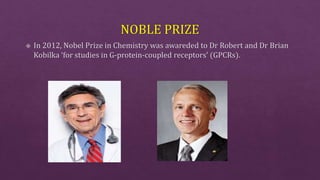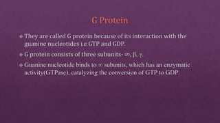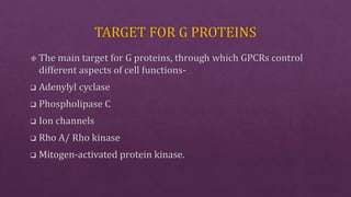 The document discusses five classes of G protein-coupled receptors: A) Rhodopsin Family, the largest group which responds to neurotransmitters and neuropeptides; B) Secretin/glucagon receptor family which responds to peptide hormones; C) Glutamate receptor/calcium sensor family, a small group including GABAB and calcium sensing receptors; D) Frizzled G protein receptors; and E) Adhesion GPCRs. It also lists the main subtypes of G proteins - Gs, Gi, Go, and Gq - and their main effectors and clinical significance like stimulating or inhibiting adenylyl cyclase.
