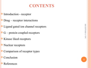 The document presents an extensive overview of receptors, detailing their types, mechanisms, and interactions with drugs. It discusses various receptor classifications such as ligand-gated ion channels, G-protein coupled receptors, and nuclear receptors, alongside their roles in pharmacology. Additionally, it emphasizes the importance of receptor pharmacology in drug discovery and treatment of diseases, highlighting the need for further research.