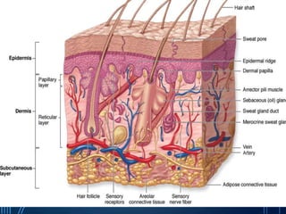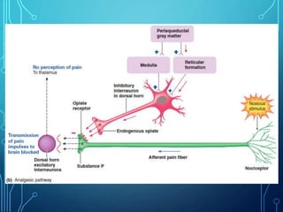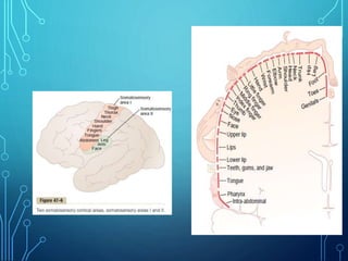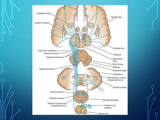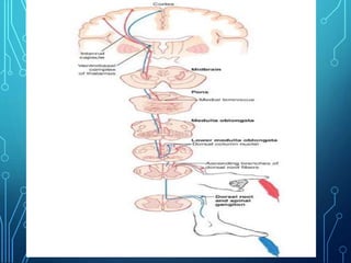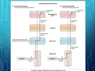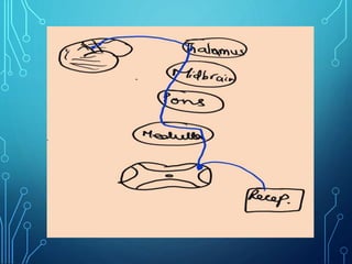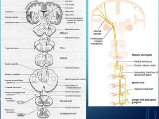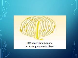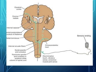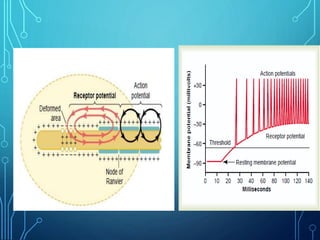 Sensory receptors detect stimuli from the internal and external environment and transmit this information to the central nervous system via sensory neurons. There are several types of sensory receptors that detect different modalities like touch, pressure, vibration, temperature, and pain. Mechanoreceptors include receptors that detect touch and pressure like free nerve endings, Meissner's corpuscles, Merkel's discs, hair receptors, Ruffini endings, and Pacinian corpuscles. Tactile signals are transmitted via myelinated A-beta fibers while pain and itch signals use small diameter C fibers. The dorsal column medial lemniscus pathway transmits tactile, proprioceptive, and vibratory signals from the periphery to the thalamus and som