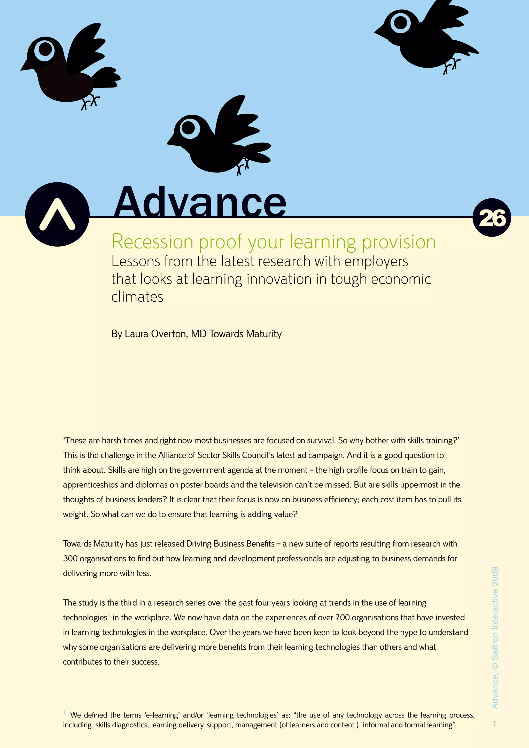 The document discusses the challenges and opportunities for skills training in businesses during tough economic times, highlighting a shift in focus towards efficiency and value in learning and development. It presents findings from research involving over 700 organizations that reveal a growing demand for learning technologies despite budget constraints. Key strategies for successful implementation include defining needs, ensuring engagement, and demonstrating value, which are essential for organizations to maximize their learning investments.
