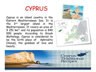 Cyprus is an island country in the Mediterranean Sea. It has a population of 840,000 people and its cuisine reflects influences from various empires and traders over 3000 years, including Greece, Turkey, Armenia, and Italy. Traditional Cypriot foods featured in the document include trahanas soup, sieftalies, afelia stew, pourgouri pilaf, halva semolina pudding, daktila ladies' fingers pastries, and mbourekia anari cheese pies. Cypriot children are shown making several of these dishes that make use of ingredients produced on the island like pork, bulgur wheat, and anari cheese.