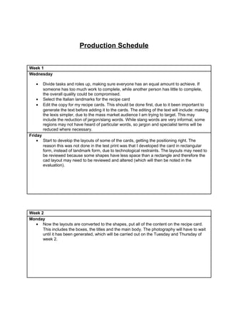This document provides a production schedule and risk assessments for a recipe card project for the Vegetarian Society. The 3-week production schedule outlines tasks for each week, including selecting landmarks, editing copy, developing layouts, adding images and content, test prints, and final printing. Two risk assessments identify potential hazards during photography, cooking, and printing stages, and relevant health and safety legislation. Contingency plans address issues like personnel absences, content not fitting cards, photos not being captured, and lost work. A budget outlines expected costs for designers, locations, office space, equipment, printing, paper, ingredients, and personnel.