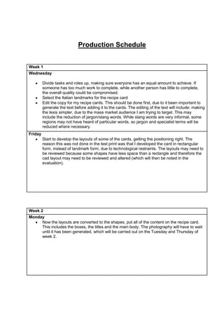 This document provides a planning and production schedule for a recipe card project for the Vegetarian Society. It outlines tasks and roles for week 1 and 2, including editing recipe texts, developing card layouts, adding images and content, and carrying out test and final prints. It also includes risk assessments for the photography and printing stages, identifying potential hazards and controls. Relevant health and safety legislation is discussed. Contingency plans are proposed for issues like personnel absences or delays. A budget outlines expected costs for designers, locations, office space, equipment, printing, and personnel.