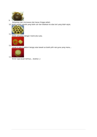 Dokumen ini berisi berbagai resep kue dan makanan ringan, termasuk tart coklat, cornflakes choco, biskut bangkit, dan lain-lain, lengkap dengan bahan dan cara pembuatan. Setiap resep menyediakan takaran bahan yang berbeda-beda, dan cara memasak yang unik. Dengan panduan ini, pembaca dapat mencoba membuat variasi kue untuk berbagai keperluan.