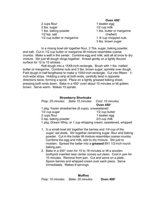 The document provides recipes for various quick breads including biscuits, muffins, pancakes, waffles, banana nut bread, and coffee cake. The recipes include ingredients lists and instructions for mixing, baking, and serving the breads. The recipes are designed to be easy to make using basic ingredients commonly found in homes. The quick breads can be made and served within an hour or less.