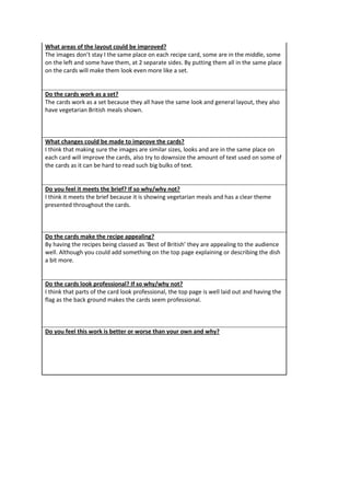 The document contains feedback on recipe cards for a set of British vegetarian meals. The summary provides: