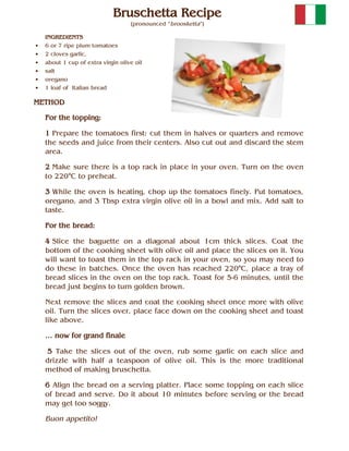 Bruschetta is an Italian appetizer made with toasted bread, tomatoes, olive oil, and herbs. The recipe calls for chopping tomatoes and mixing them with olive oil, salt, and oregano. Bread is sliced and toasted until golden brown. The toasted bread is then rubbed with garlic and drizzled with olive oil before topping with the tomato mixture. The bruschetta is served within 10 minutes to prevent the bread from getting soggy.