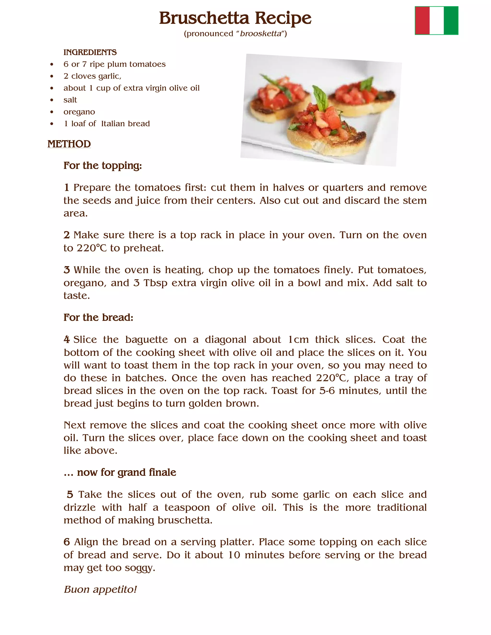 Bruschetta is an Italian appetizer made with toasted bread, tomatoes, olive oil, and herbs. The recipe calls for chopping tomatoes and mixing them with olive oil, salt, and oregano. Bread is sliced and toasted until golden brown. The toasted bread is then rubbed with garlic and drizzled with olive oil before topping with the tomato mixture. The bruschetta is served within 10 minutes to prevent the bread from getting soggy.