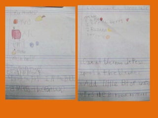 The Powerful Panthers wrote recipes for healthy snacks made from fruits and vegetables bought at the market. They gave the recipes to their teacher Mr. Gillespie so he could make the snacks at home. They then reflected on how to improve the recipes by adding pictures, making the text bigger and numbering the steps. They discussed using a computer to make editing and printing the recipes easier. Finally, they decided to compile the recipes into a cookbook to give to Mr. Gillespie and let others taste their healthy cooking.