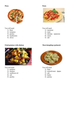The document provides ingredient lists for 14 different recipes including pancakes, fruit salad, fried eggs with tomatoes, Japanese rolls, pizza, pasta, fried potatoes with chicken, meat dumplings, and more. For each recipe, the list includes 5 main ingredients or components needed to prepare the dish. Common ingredients mentioned across multiple recipes include flour, eggs, meat, tomatoes, salt, and oil.