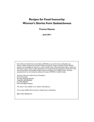 This document summarizes a study on food insecurity among women in Saskatchewan. It provides background information on definitions of food security and insecurity. Food insecurity can be experienced at the individual, household, community and cultural levels. It then outlines the study's methods of interviewing women in rural, remote and urban areas of Saskatchewan. Key findings included the stigma of food insecurity, its physical and mental health impacts, and challenges with access, affordability and approaches to nutritious food. The conclusion discusses implications for public policy around income support and food security.