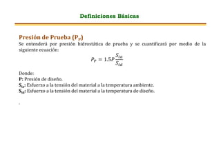 The document defines key terms related to pressure vessels including pressure vessel, operating pressure, design pressure, and test pressure. It then provides equations to calculate the minimum required thickness for different types of pressure vessel heads, including torispherical, elliptical, hemispherical, 80:10, conical, and toriconical heads. Factors considered in the equations include design pressure, interior radius, material strength, and weld efficiency.