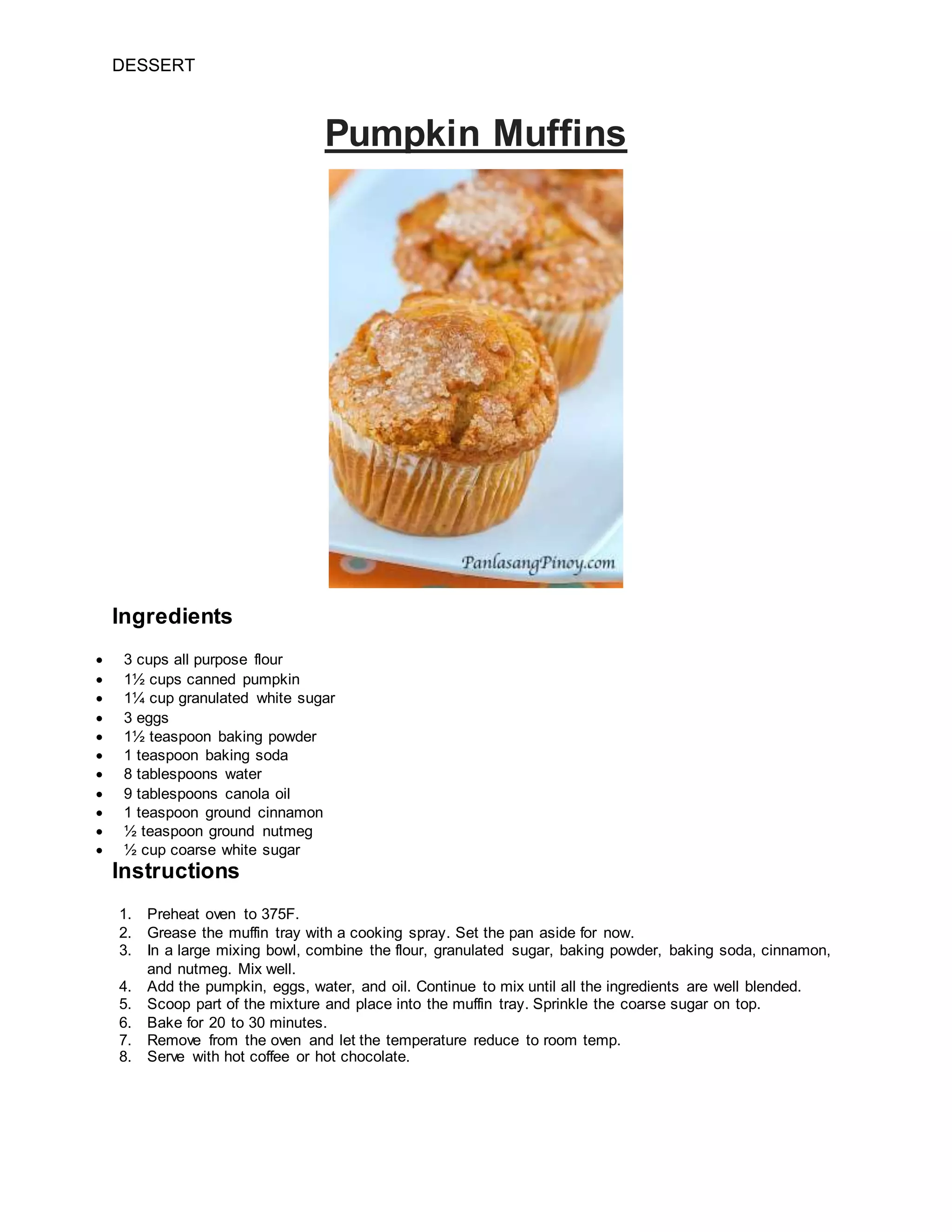 - Pumpkin muffins made with flour, pumpkin, sugar, eggs, baking powder, oil, cinnamon, and nutmeg.