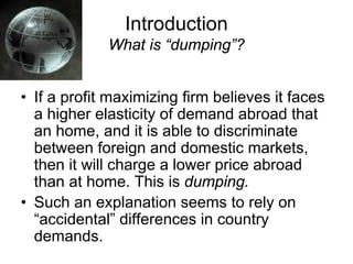 The document discusses the reciprocal dumping model of international trade, highlighting how firms may engage in dumping by charging lower prices abroad due to different demand elasticity. It presents a basic Cournot duopoly framework to analyze welfare implications and concludes that while reciprocal dumping can lead to welfare gains, it may also not be Pareto efficient. The findings suggest that oligopolistic competition allows trade without typical motivations such as cost differences or economies of scale, and emphasize the importance of market segmentation in this context.